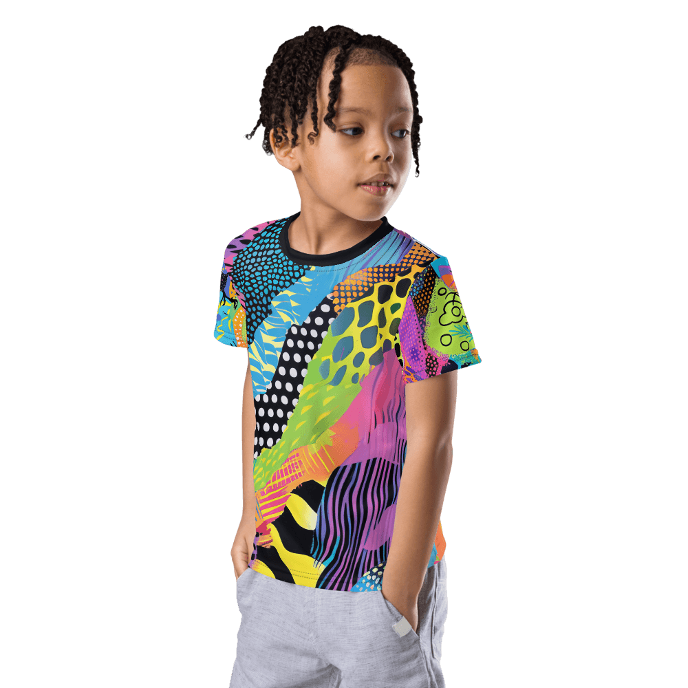Unleash your wild side with our All The Animals t-shirt. This vibrant design showcases a menagerie of colourful animal prints, creating a bold and playful style.