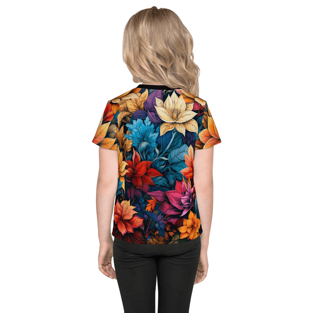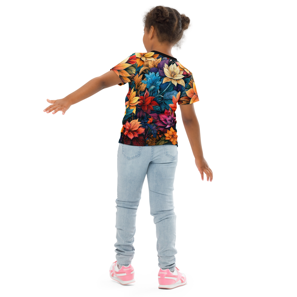 Embrace the beauty of fall with our Autumn Leaves t-shirt. This vibrant design showcases a colourful array of leaves and flowers, capturing the season's warm, enchanting essence.