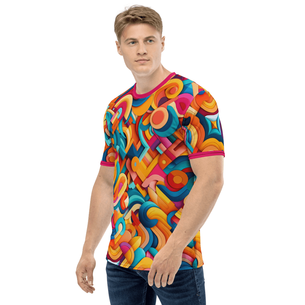 Energize your wardrobe with our Charge t-shirt. This psychedelic kaleidoscope of pink, orange, yellow, and blue geometric patterns creates a mesmerizing, mind-bending work of wearable art.