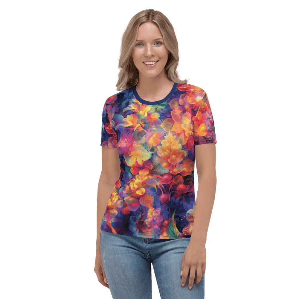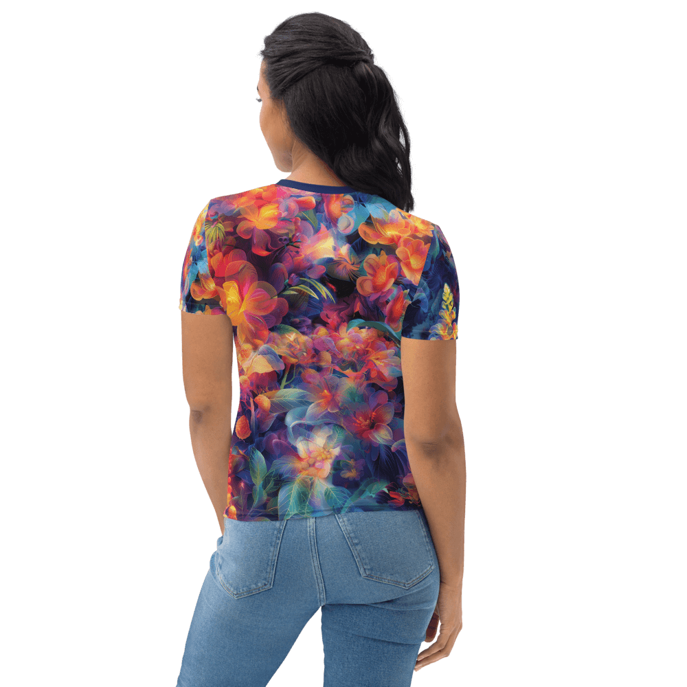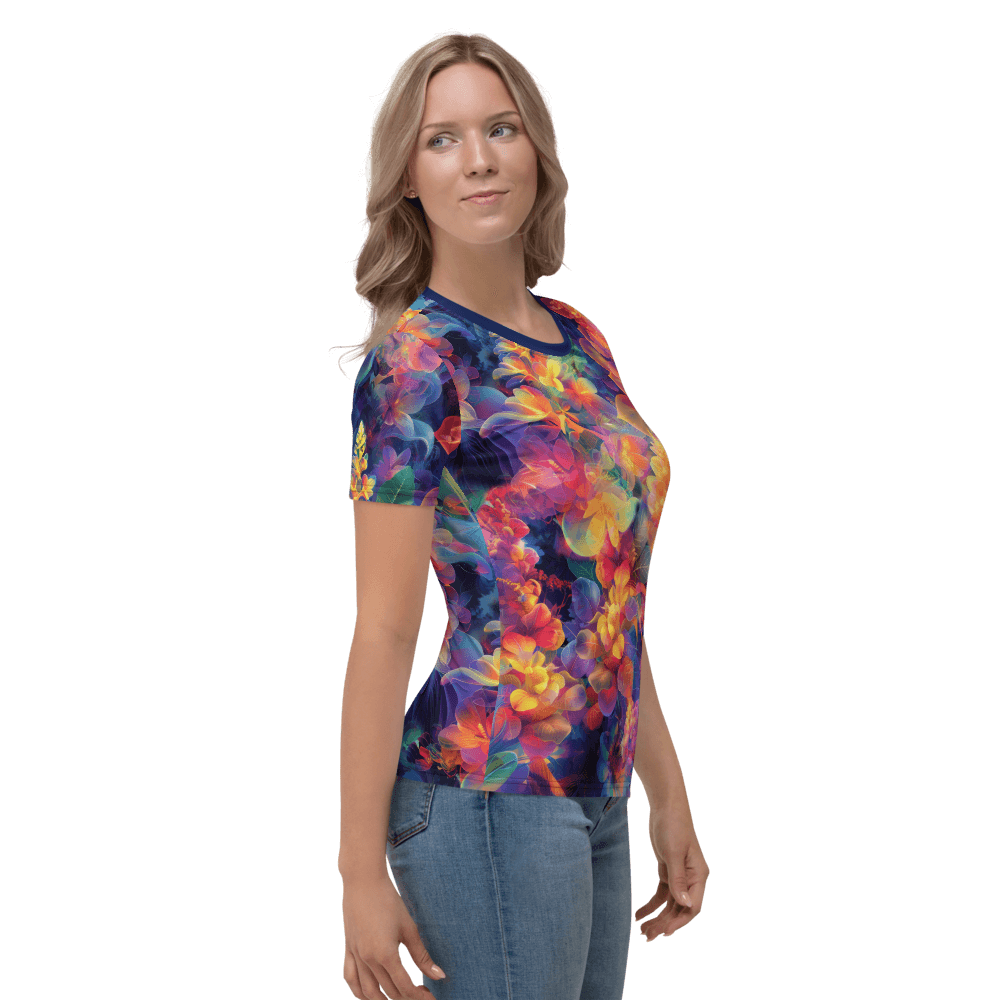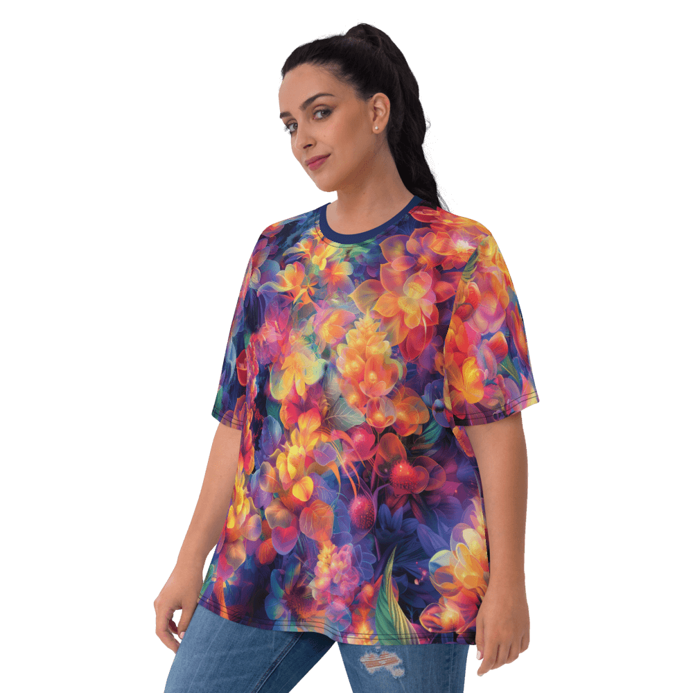 Dive into Dark Eden, where neon blooms burst against midnight shadows. This mesmerizing t-shirt design combines ethereal florals with psychedelic vibrancy, creating a wearable garden of otherworldly beauty.