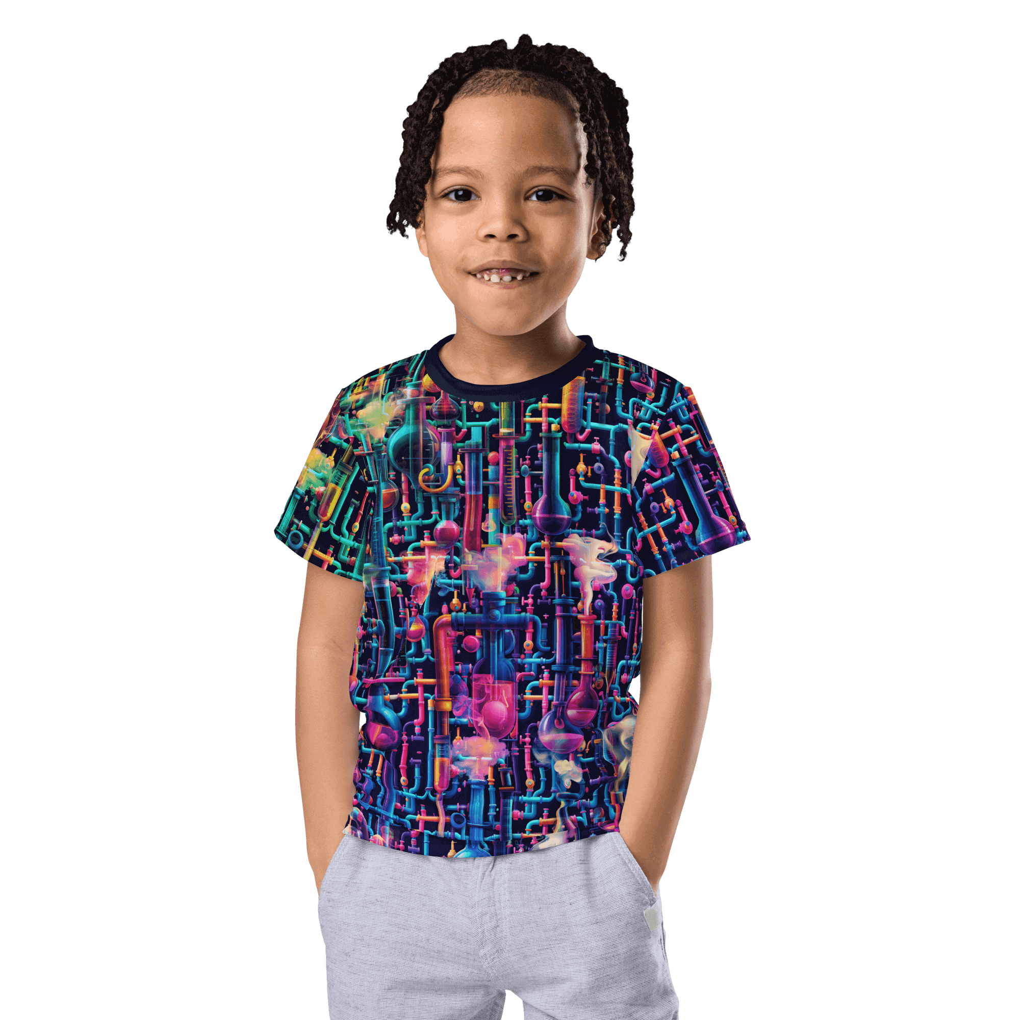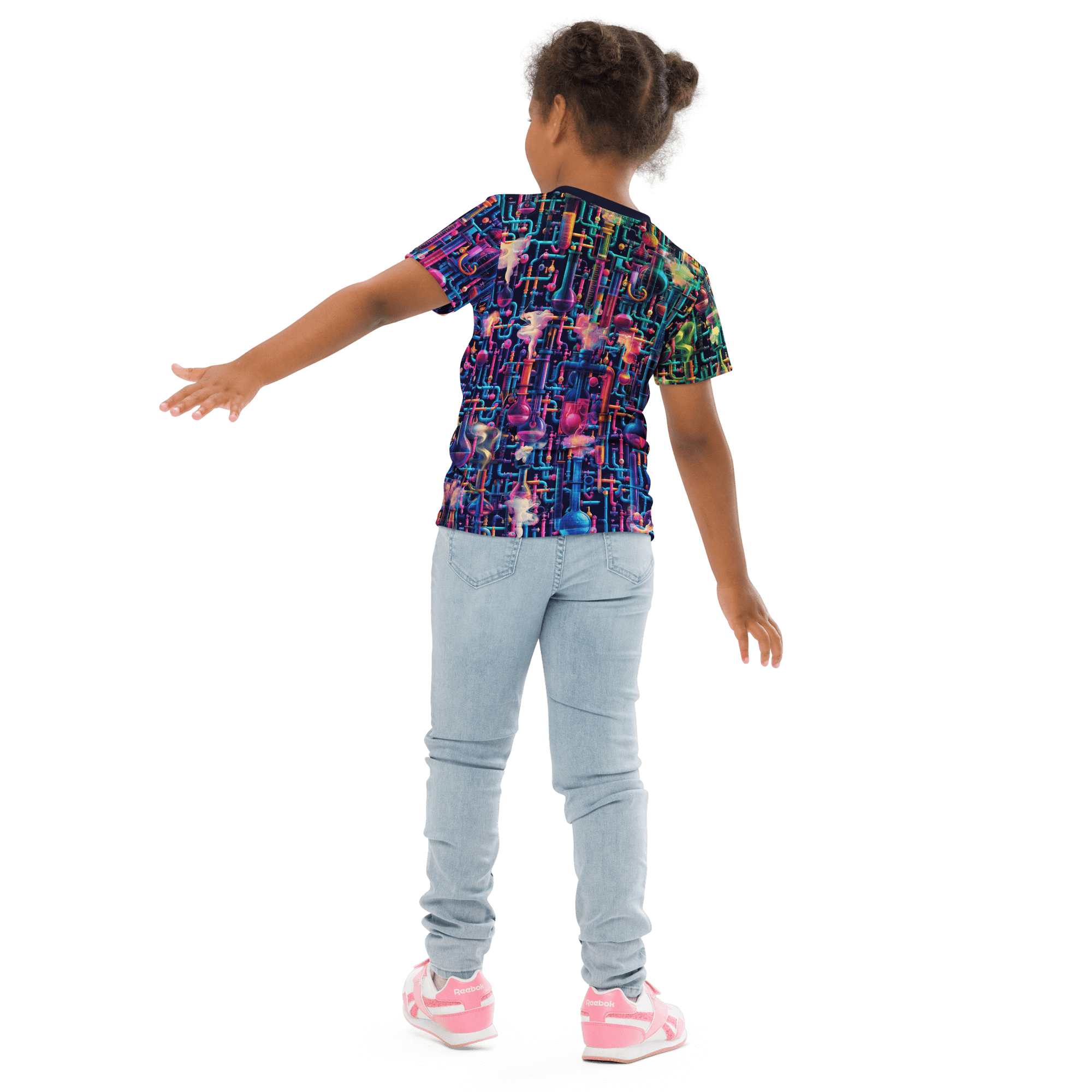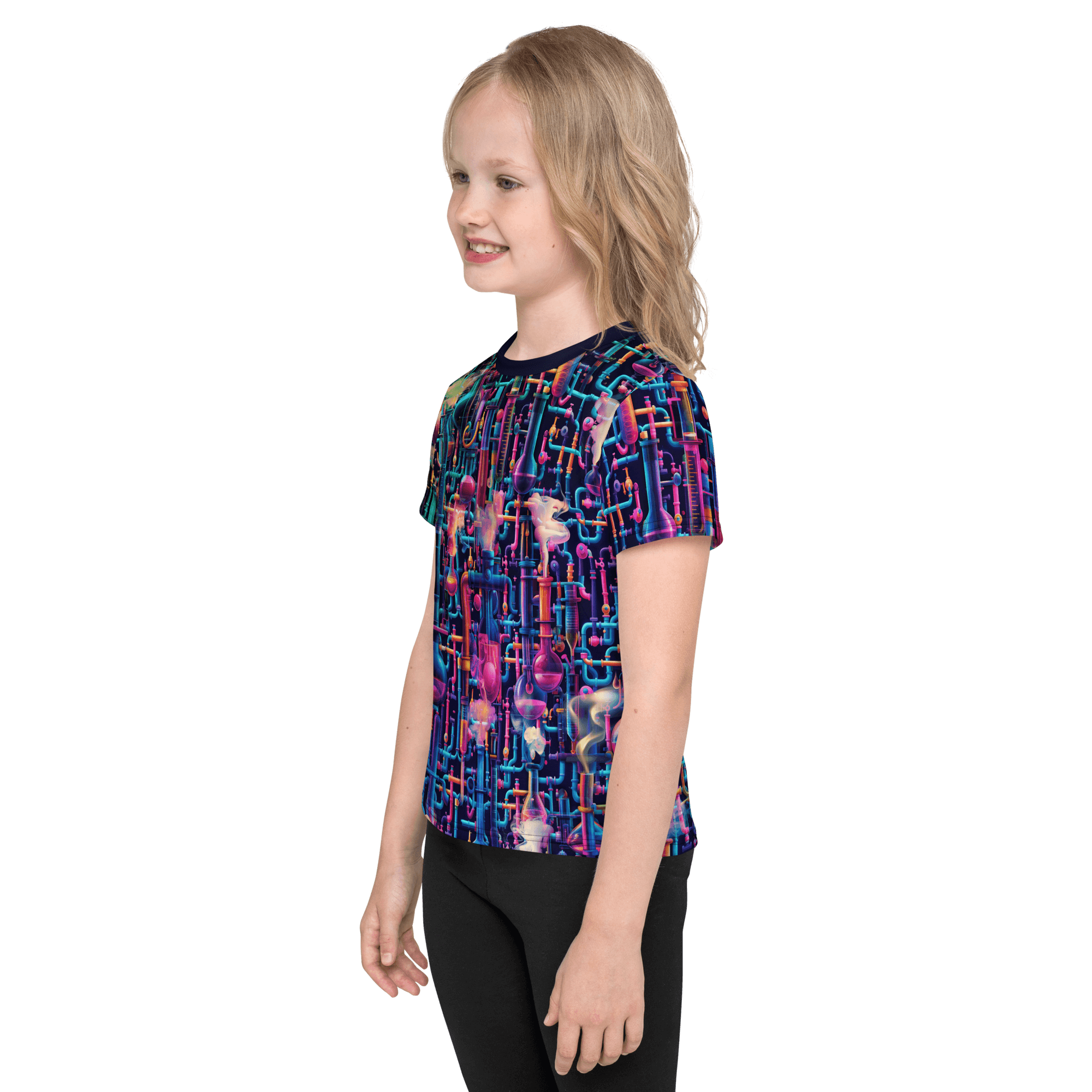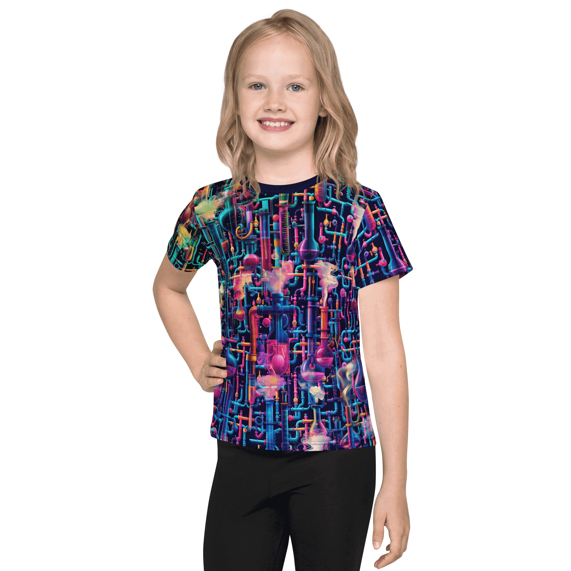 Step into Emily's Lab, where science meets psychedelia. This t-shirt features a dark chemistry laboratory alive with fluorescent chemicals, swirling smoke, and mystical lab equipment.