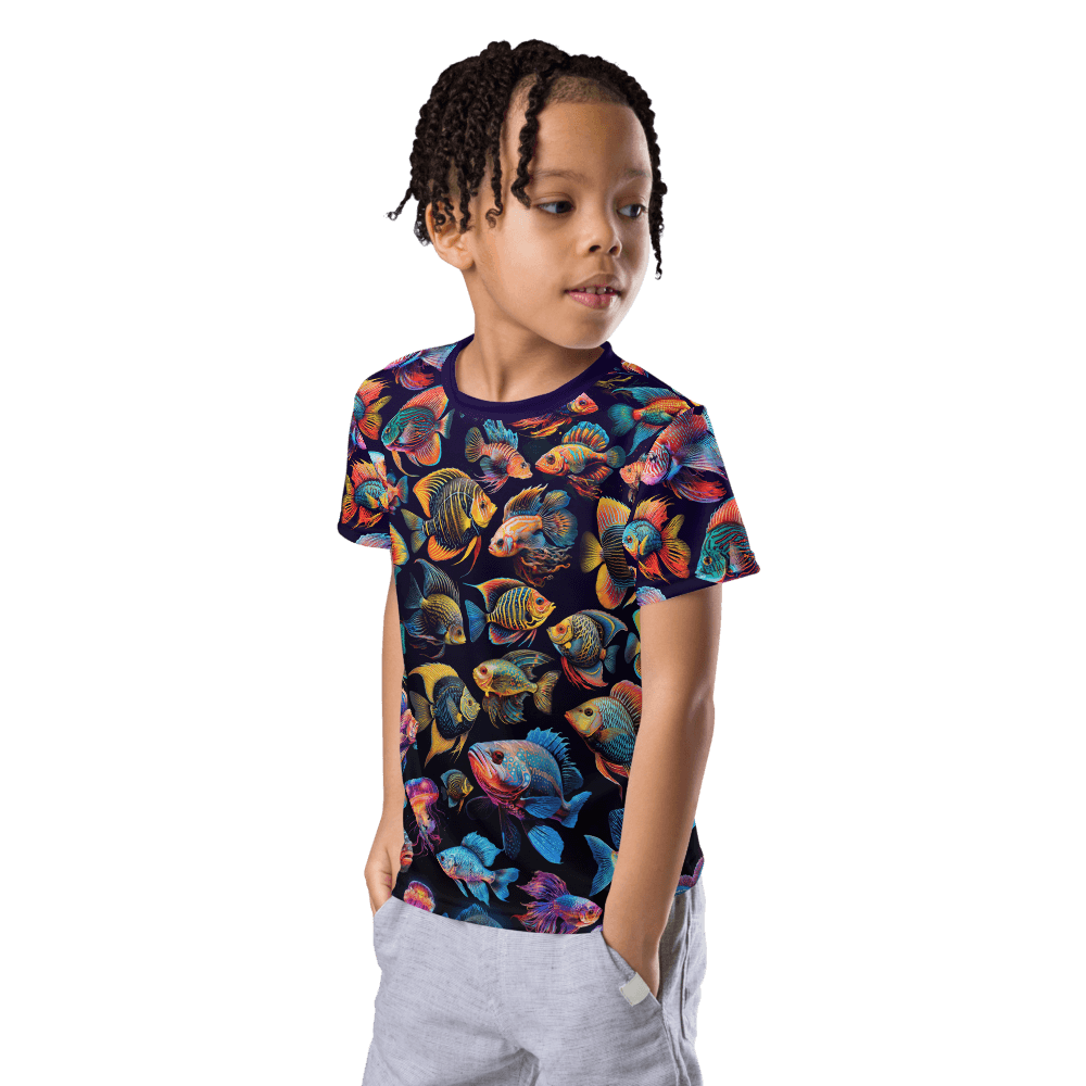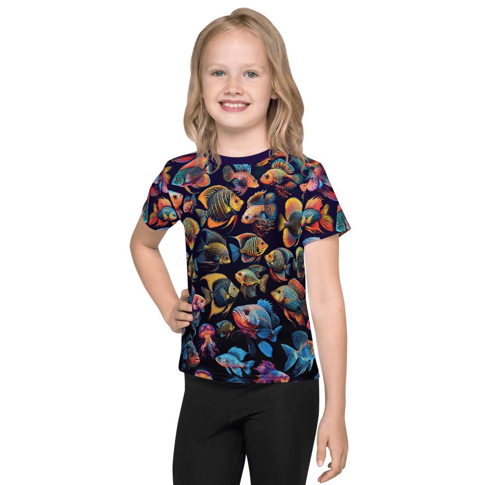 Immerse yourself in the aquatic allure of our Fishtopia t-shirt! Set against a deep, mysterious backdrop, bright, colourful fish spring to life, creating a striking contrast that's sure to captivate. It's a deep dive into fashion's ocean, bringing a wave of maritime magic to your everyday style. Cast your net and catch the eye!