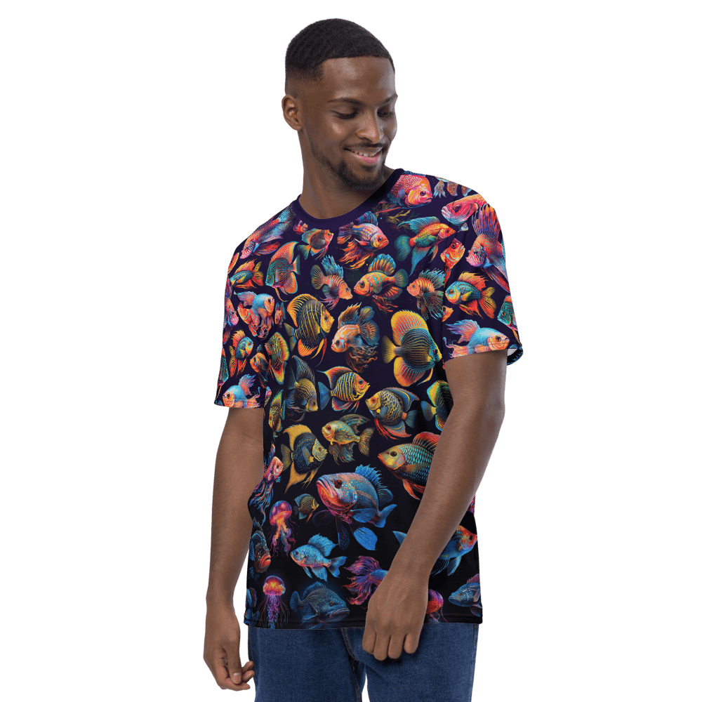 Immerse yourself in the aquatic allure of our Fishtopia t-shirt! Set against a deep, mysterious backdrop, bright, colourful fish spring to life, creating a striking contrast that's sure to captivate. It's a deep dive into fashion's ocean, bringing a wave of maritime magic to your everyday style. Cast your net and catch the eye!
