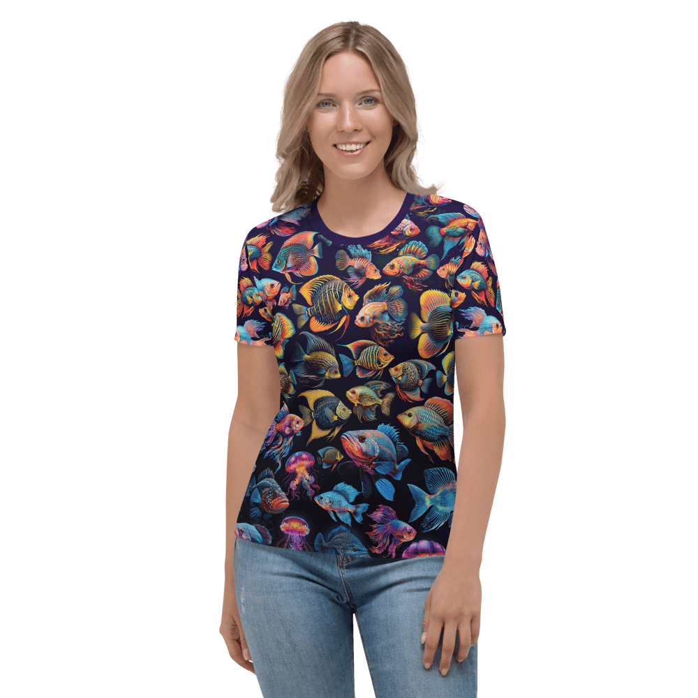 Immerse yourself in the aquatic allure of our Fishtopia t-shirt! Set against a deep, mysterious backdrop, bright, colourful fish spring to life, creating a striking contrast that's sure to captivate. It's a deep dive into fashion's ocean, bringing a wave of maritime magic to your everyday style. Cast your net and catch the eye!