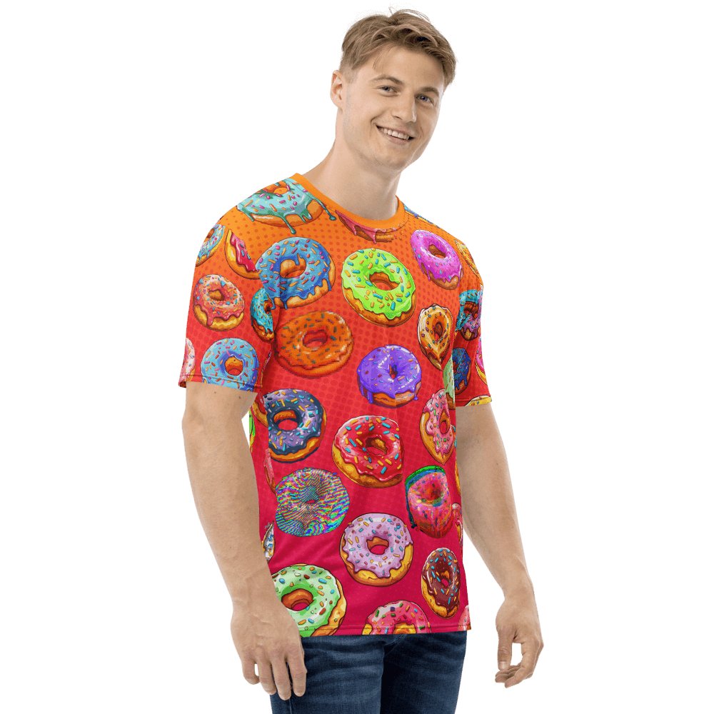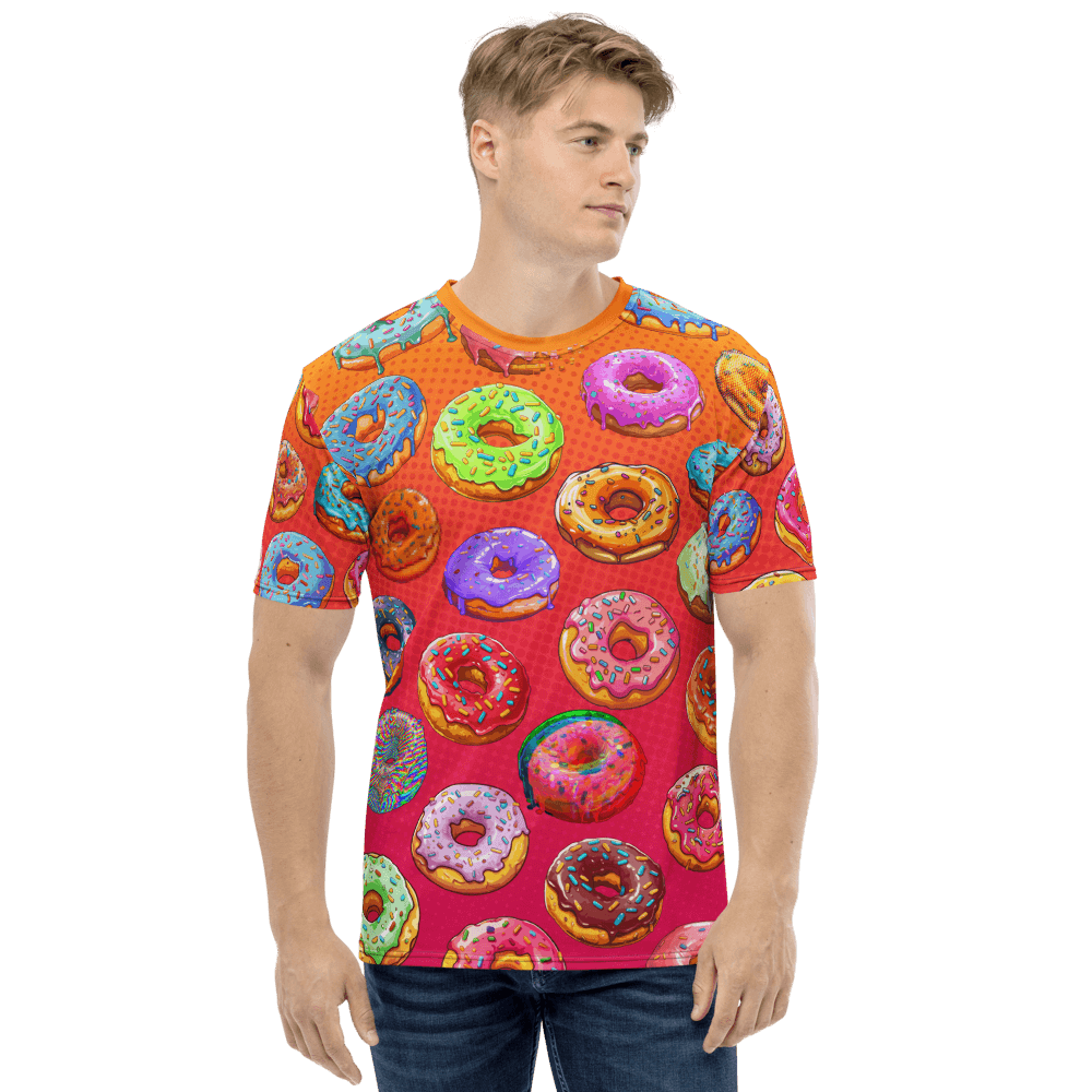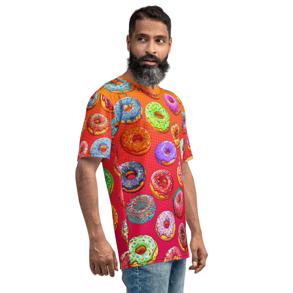Indulge yourself with this donut t-shirt! Wrapped in bright, whimsical cartoons of your favourite sugary confections, it's a wearable piece of joy. This shirt is a recipe for smiles, sprinkling fun and fashion in equal measure. Bite into life with style; embrace your sweet side!