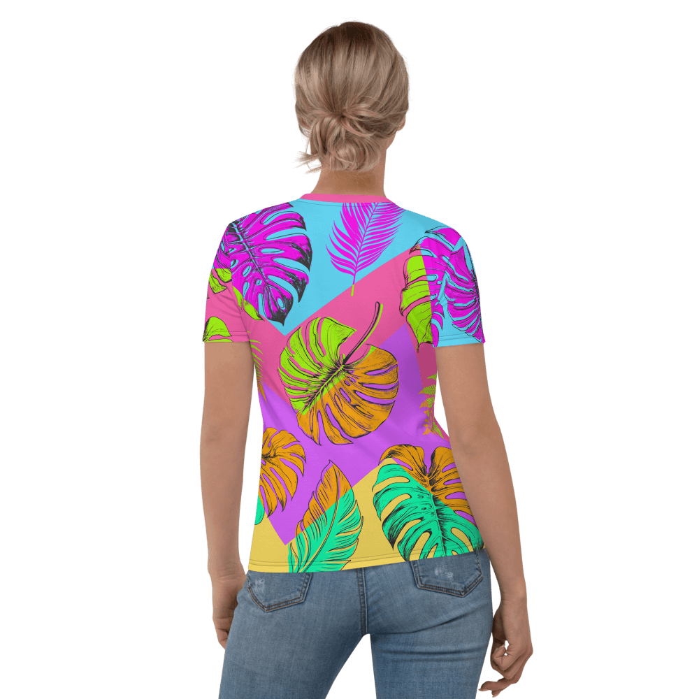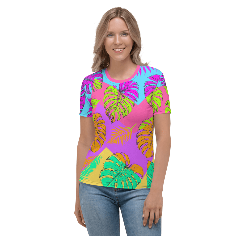 Bask in tropical vibes with our Radiance t-shirt. Large Swiss cheese plant and fern leaves pop against a vibrant blue, pink, purple, and yellow background, creating a stunning, energetic design.